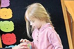 Four-year-old Andrea Stiver uses pennies to “buy pancakes” during the National Pancake Day themed Storytime on Tuesday, Feb. 17, at …