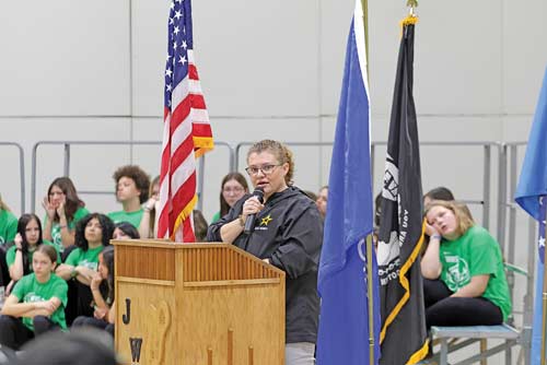 Rhinelander’s James Williams Middle School hosted its 54th annual Veterans Day program on Monday, Nov. 11. Eighth-grade students Keyan Karpf and Lola Beach emceed the event, which featured musical selections performed by the JWMS band and choir. The guest speaker was Casey Lehmann, a Rhinelander Swim Club coach and Nicolet College employee. Lehmann joined the Wisconsin Army National Guard during her junior year of high school and attended basic training during the summer between junior and season year. She served in Charlie Company 724th Engineer Battalion (Rhinelander and Tomahawk) for six years and was deployed to Iraq in 2003. Lehmann joined the Guard to help pay for college and to help others, she said. “Like many of you, I had a dream of going to college, but I knew that my parents couldn’t afford to pay for my education. I also wanted to help others. The National Guard was my answer because they gave me tuition assistance to pay for college and the Guard responds to natural disasters and other emergencies, so there was an opportunity to help others,” she explained. Lehmann admitted she did not anticipate being sent overseas, as her unit hadn’t been deployed in 50 years. It was a daunting but fulfilling experience. “The friendships I made with my fellow soldiers were some of the strongest bonds I had ever experienced,” she said. “We relied on each other, and together we accomplished things I never thought possible...I became a better person and learned to appreciate what I had at home.”