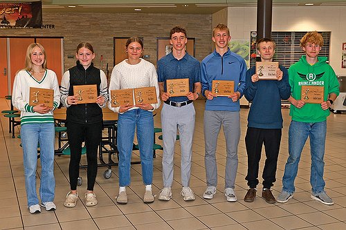 Rhinelander High School cross country team award winners pose for a photograph following the team’s banquet in the RHS commons Sunday, Nov. 2. Pictured, from left to right, are Kara Monk, Noelle Mayo, Macy Myers, Avrom Barr, Jackson Weinzatl, Michael Brunette and Jonathan Campbell. (Bob Mainhardt for the River News)Fastest harrier is more or less a de facto MVP award, presented to the runners who led the way for the team this year. Barr and Myers did that in all 11 events this year as their seasons ended Nov. 1 at the WIAA state meet in Wisconsin Rapids.