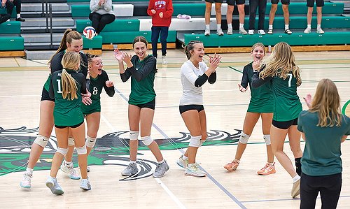 In this Oct. 13, 2025 file photo, members for the Rhinelander High School volleyball team, from left to right, Kenzie Paulson, Corynn Waksmonski, Kylie Treder, Vayda Ives, Kayla Skubal, Maddie Paulson and Ava Rathbun, react after Rhinelander defeated Hurley in five sets in a non-conference volleyball match at the Jim Miazga Community Gymnasium. Though the Hodags had a long season, they played some of their best volleyball at the end — as evidenced by the Hurley win and taking a set from Mauston in the WIAA tournament. (Bob Mainhardt for the River News)While there weren’t many highlights for the Hodags during the season, the team saved two of them for their final two matches.
