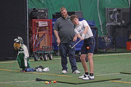 “Really, we’ve got a great opportunity here to have this practice facility,” coach Adam Schmidt said. “Today we just picked our 150-yard club. Just want to see some of the kids’ swings, worked on some of their swings, let them hit range balls, and then worked on indoor chipping. Pretty much what we all we can do in here, but that’s nice because there’s a lot of schools that are up north that can’t do a whole lot else.”