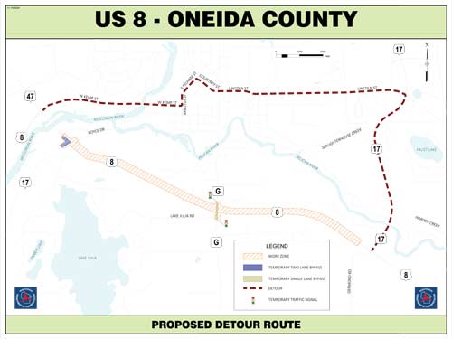 This DOT image shows the detour route for the soon-to-start U.S. Highway 8 improvement project. (Contributed image)In the $6.1 million project, footed entirely by DOT, a section of Hwy. 8 from State Highway 47 to State Highway 17 North, in the town of Pelican, will have its existing asphalt and concrete removed and replaced with a new asphalt pavement surface complete with centerline rumble strips. The intersection of Hwy. 8 with Hwy. 17 North/Germond Road will be milled and overlaid.