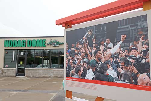Some of the history the tour brought to the Dome’s entrance include photos of Giannis Antetokounmpo during the Bucks’ championship run in 2021, a 1966 photo of the University of Wisconsin mascot, Bucky Badger, and a snapshot of Sophie Kurys, who played second base for the Racine Belles, part of the early All-American Girls Professional Baseball League.