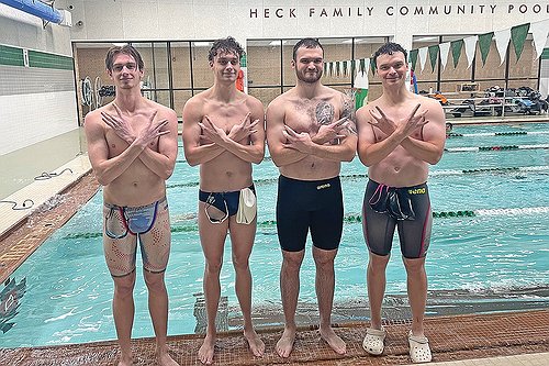 From left to right alumni Shawn Denis, Carter Gaber, Devon Gaber and Alex Gaber pose for a photograph after unofficially breaking the Heck Family Community Pool record in the 200-yard freestyle relay. The quartet posted a time of 1 minute, 28.28 seconds in the event, beating the high school boys’ record of 1:29.39 set in 2021.