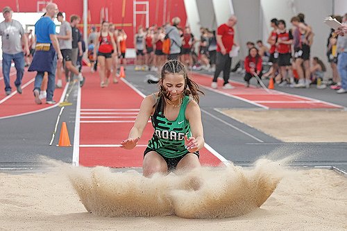 Rhinelander’s Marsadies Williams competes in the long jump during the Princeton/Green Lake Invitational at Ripon College Friday, March 20. Williams, a freshman, placed third in the event and finished in the top seven in all four of his events as the Hodags took 11th as a team. (Jeremy Mayo/River News)On the girls’ side, freshman Marsadies Williams made an impressive debut. Brand new to the sport, Williams scored in all four of her events, highlighted by a third-place showing in the long jump (15-11 1/4). She took sixth in both the 200 meters (29.43) and the pole vault (8-0) and was seventh in the 60 meters (8.52).